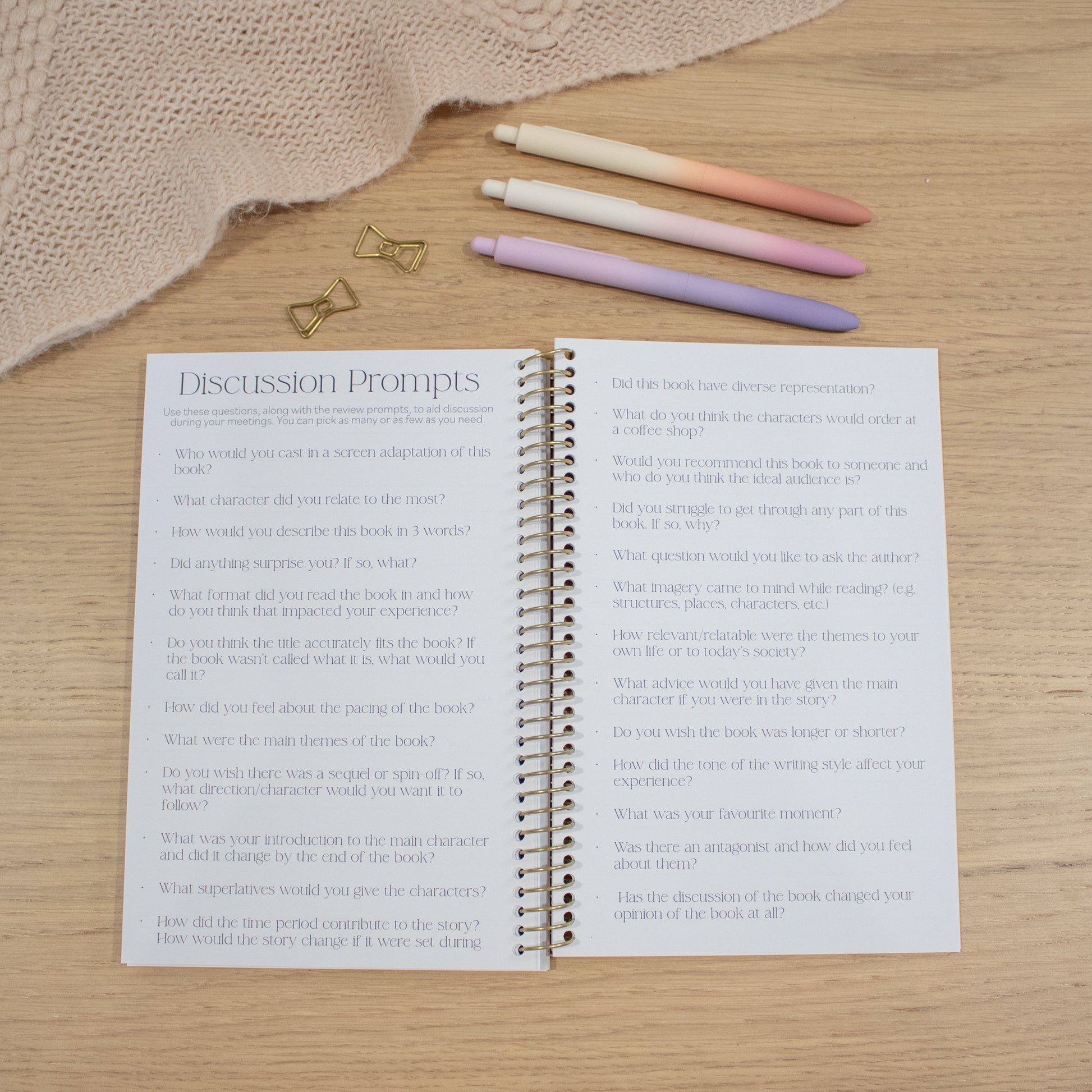 This journal is designed to keep track of all the books you read in your book club with detailed and guided reviews to help promote discussions at your meetings. These reviews record thoughts, questions, important book information and how you felt about the themes, characters, ending and so much more.