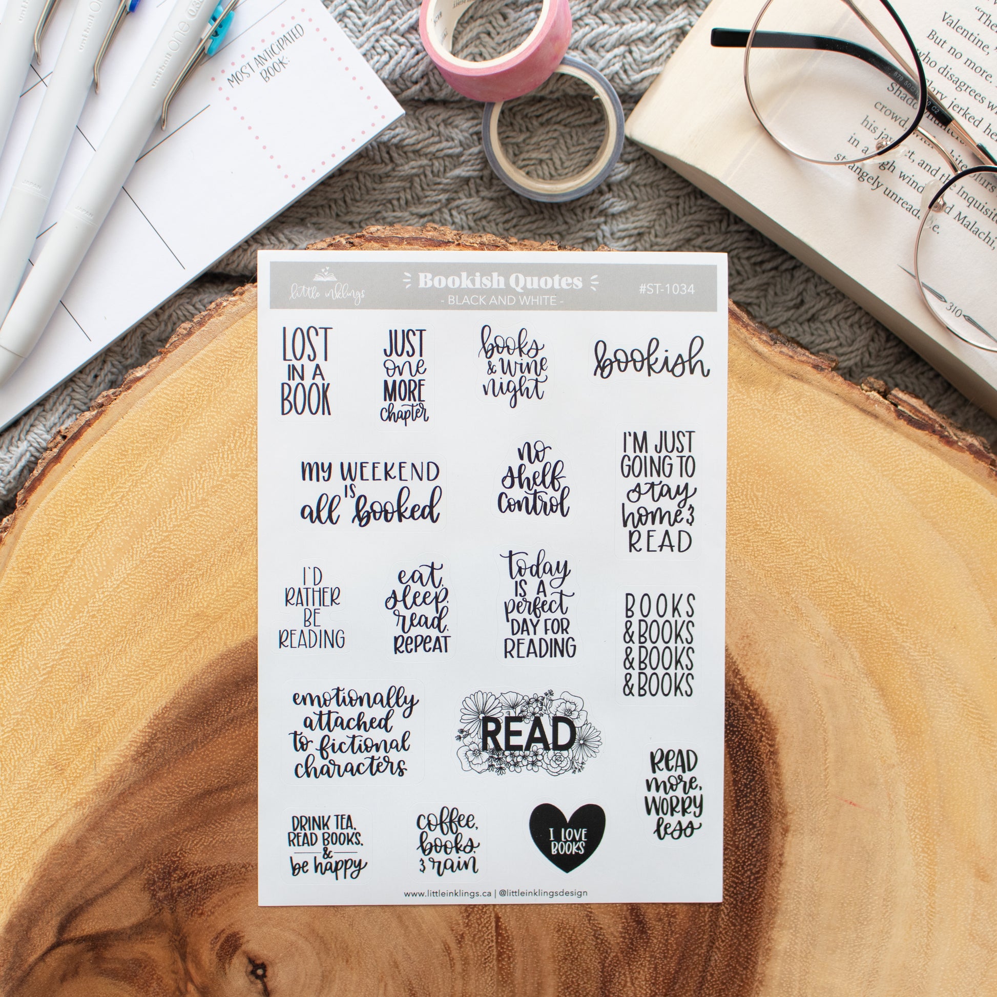 This sticker sheet includes 17 unique, hand-lettered black and white bookish quotes.