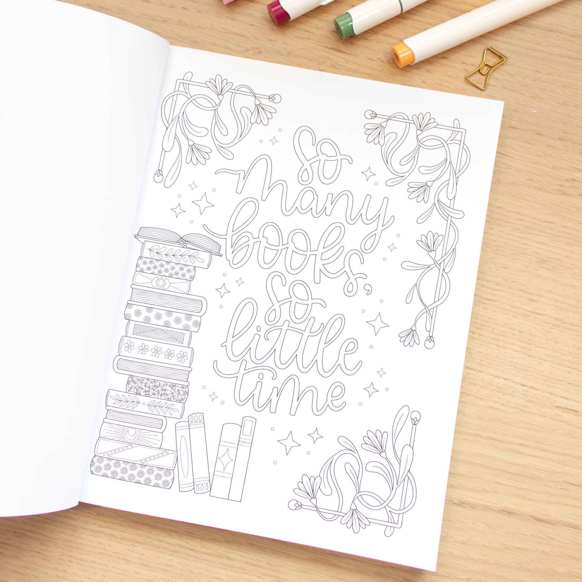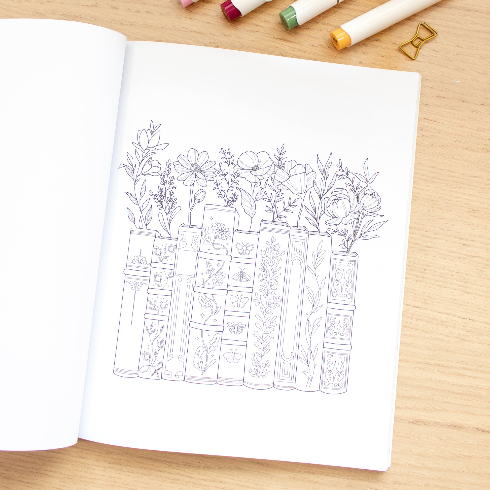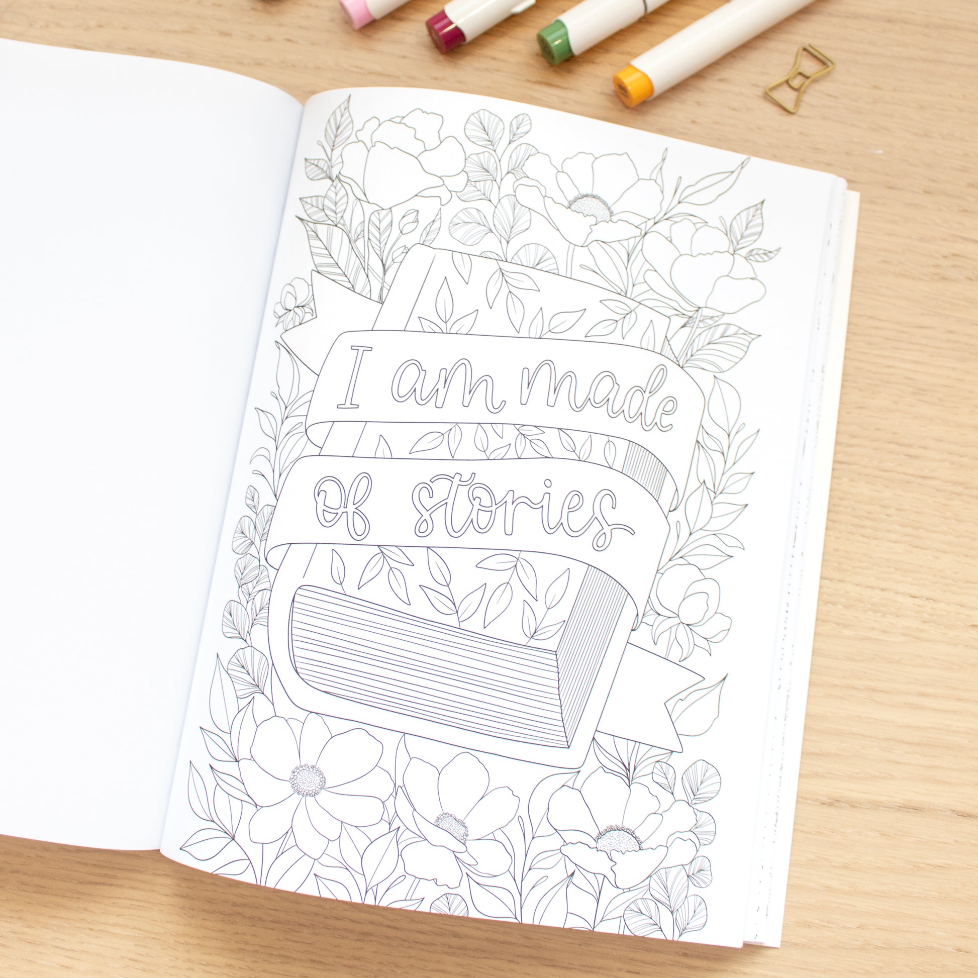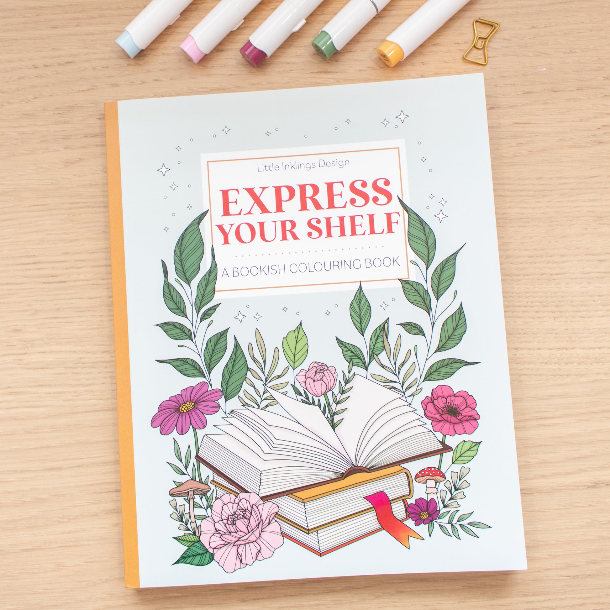 Express Your Shelf is a bookish colouring book with 50 unique, hand-drawn bookish colouring pages printed on thick, smooth paper with no designs on the back.
