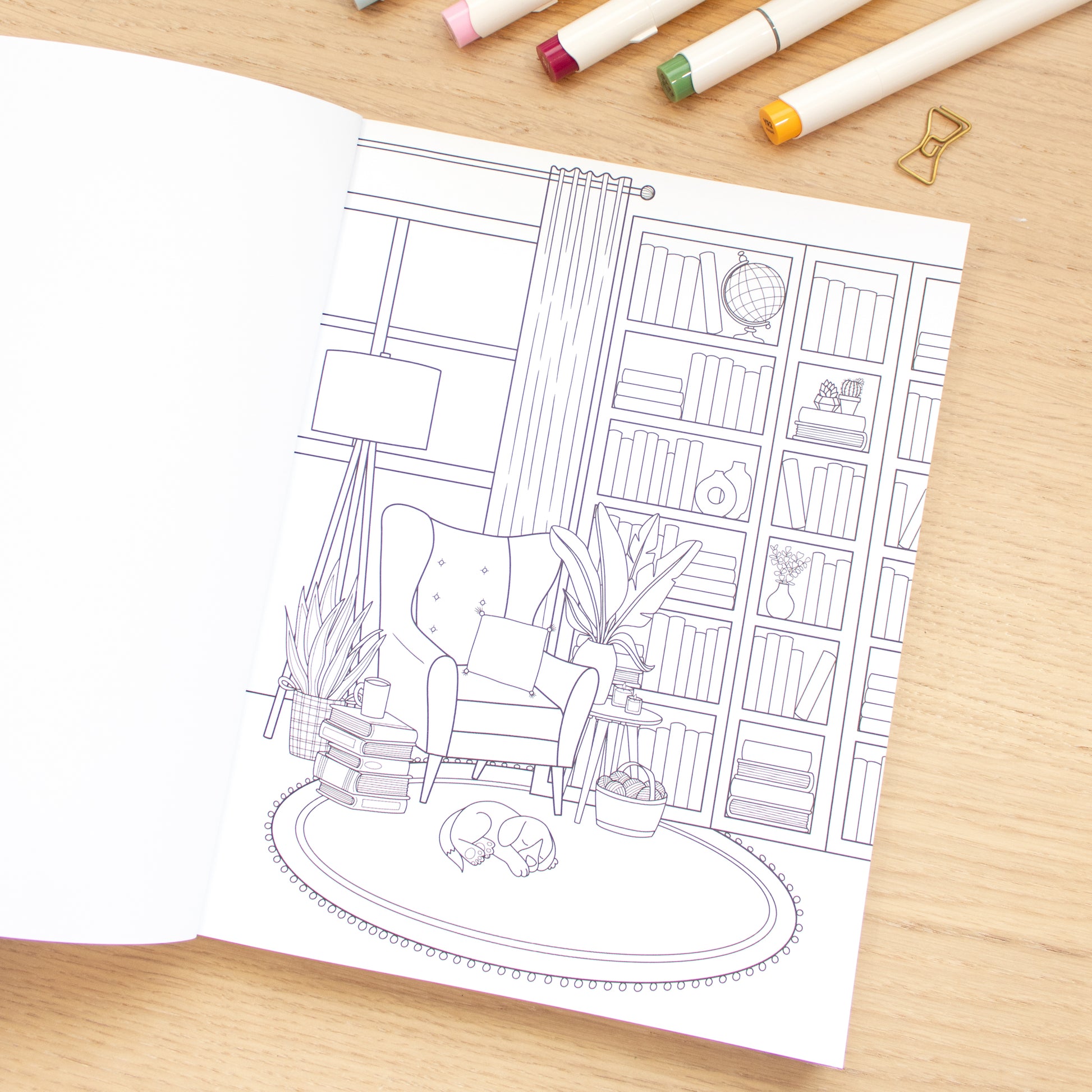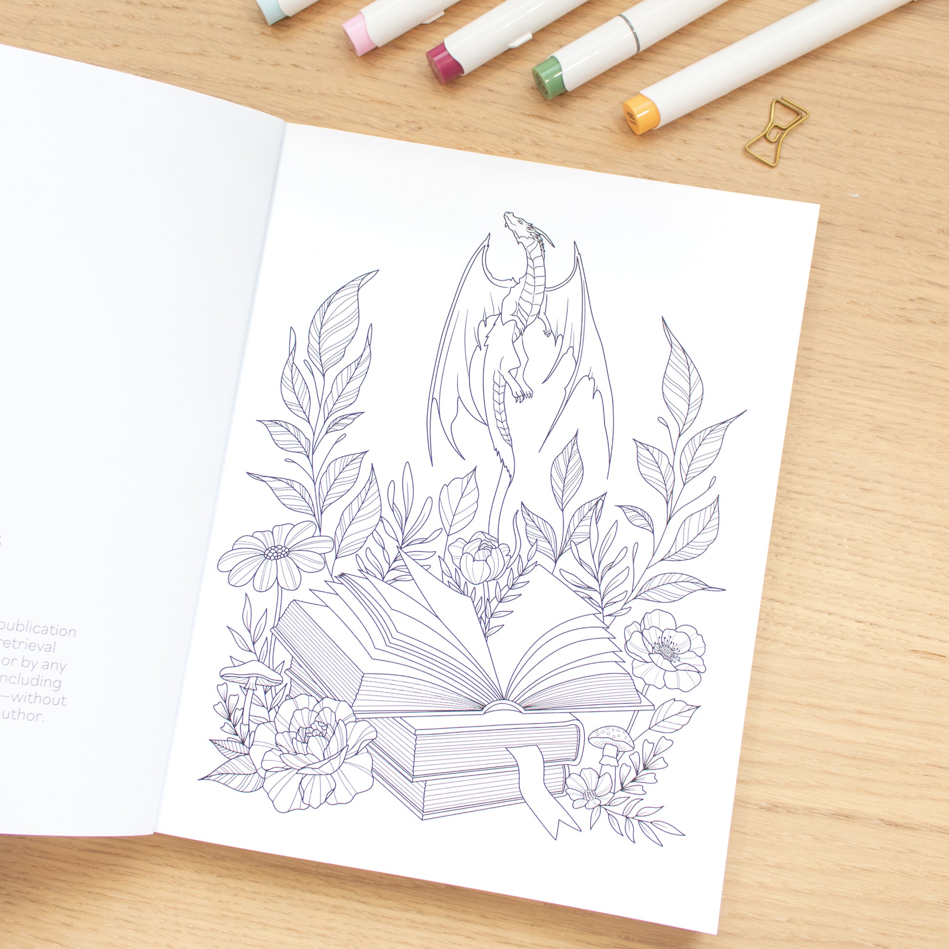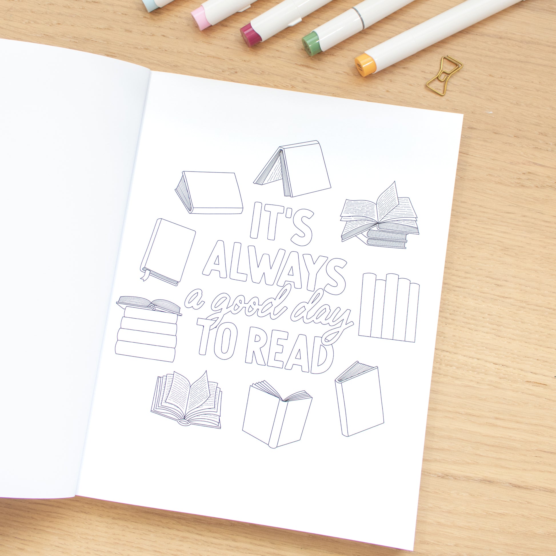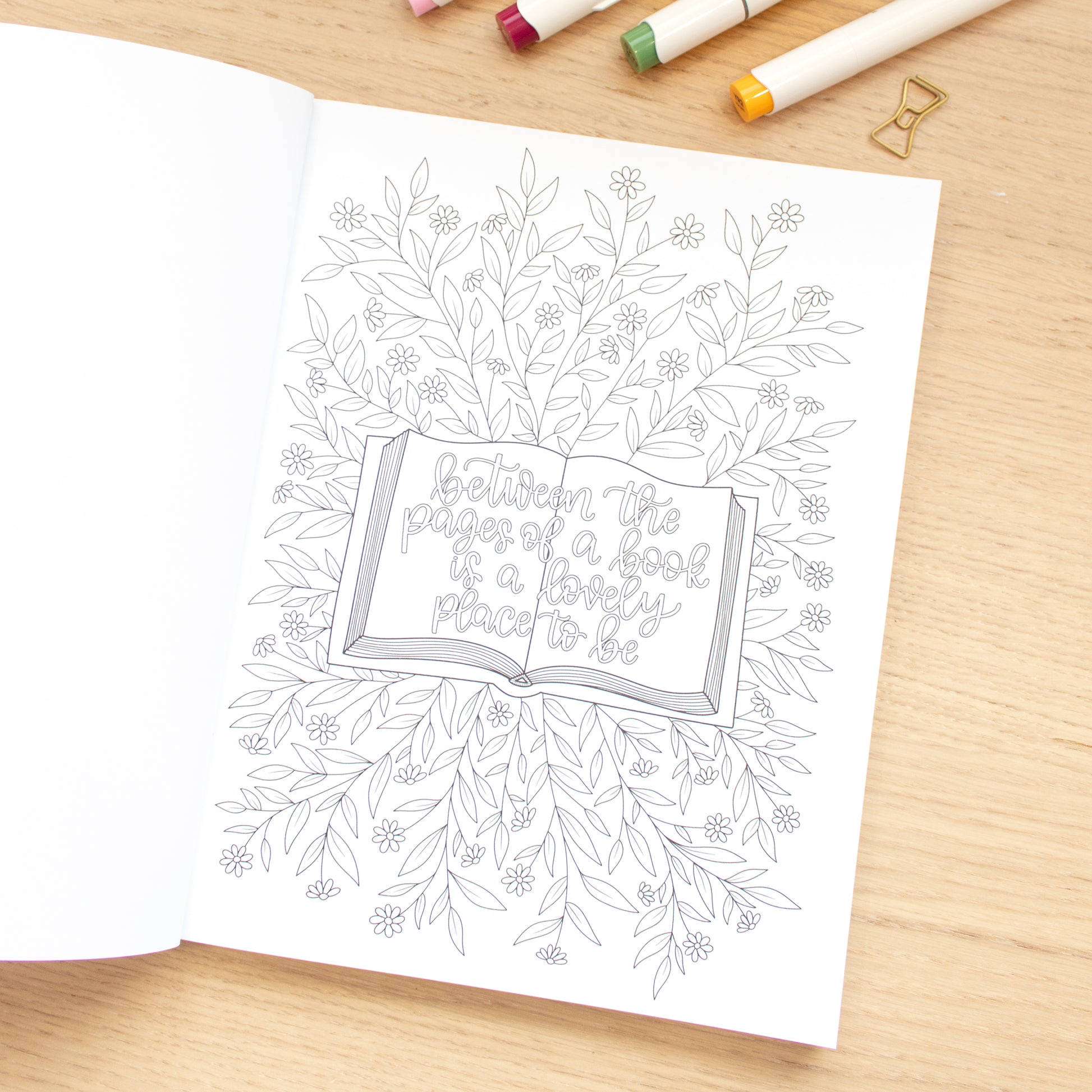 Express Your Shelf is a bookish colouring book with 50 unique, hand-drawn bookish colouring pages printed on thick, smooth paper with no designs on the back.