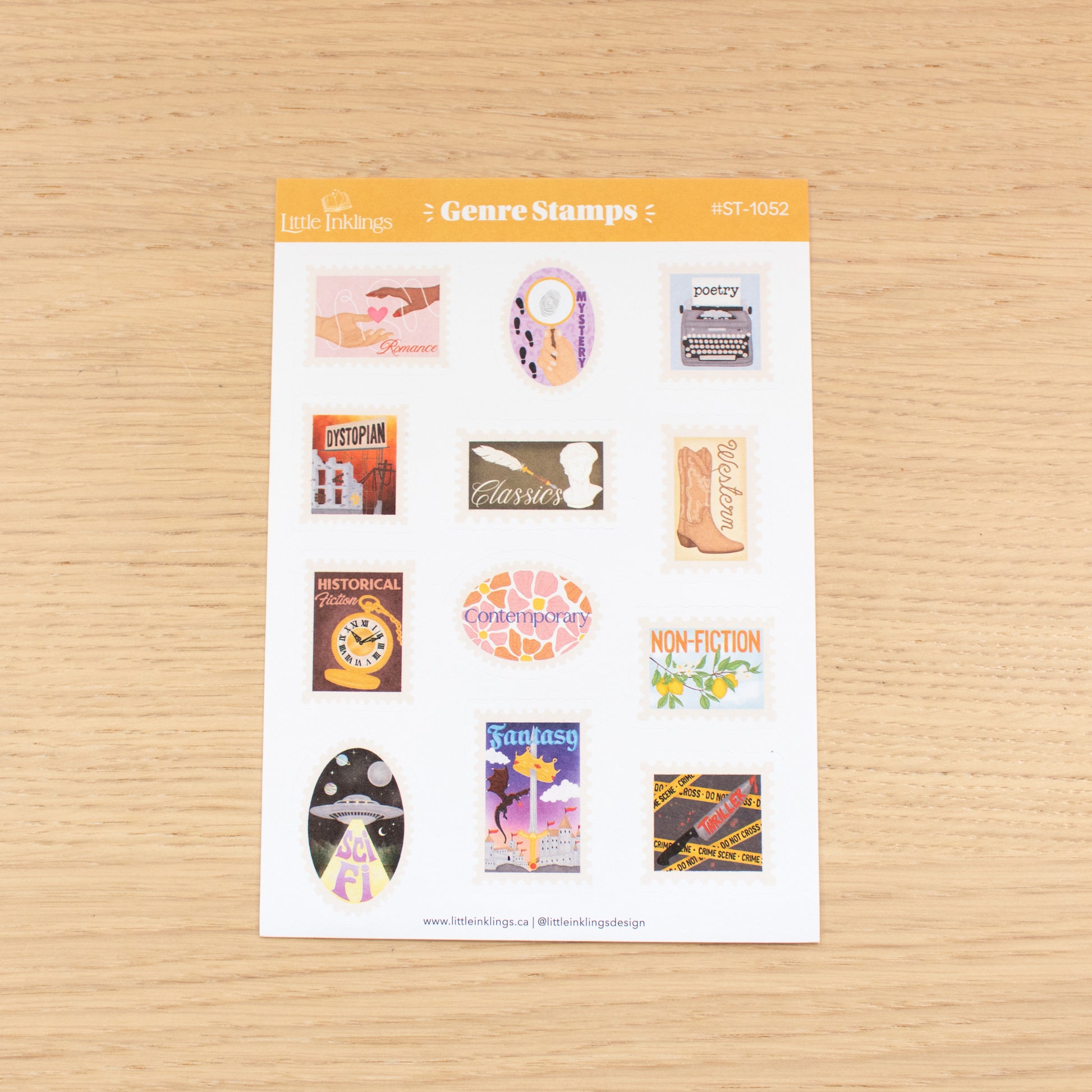 This sticker sheet includes 12 unique hand-illustrated stamps that represent 12 different book genres.