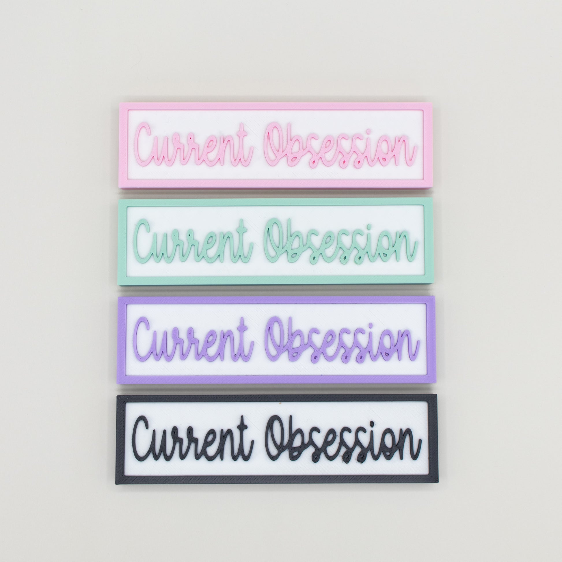 The front signs are interchangeable. This listing is for the Current Obsession option and is available in four colour options.