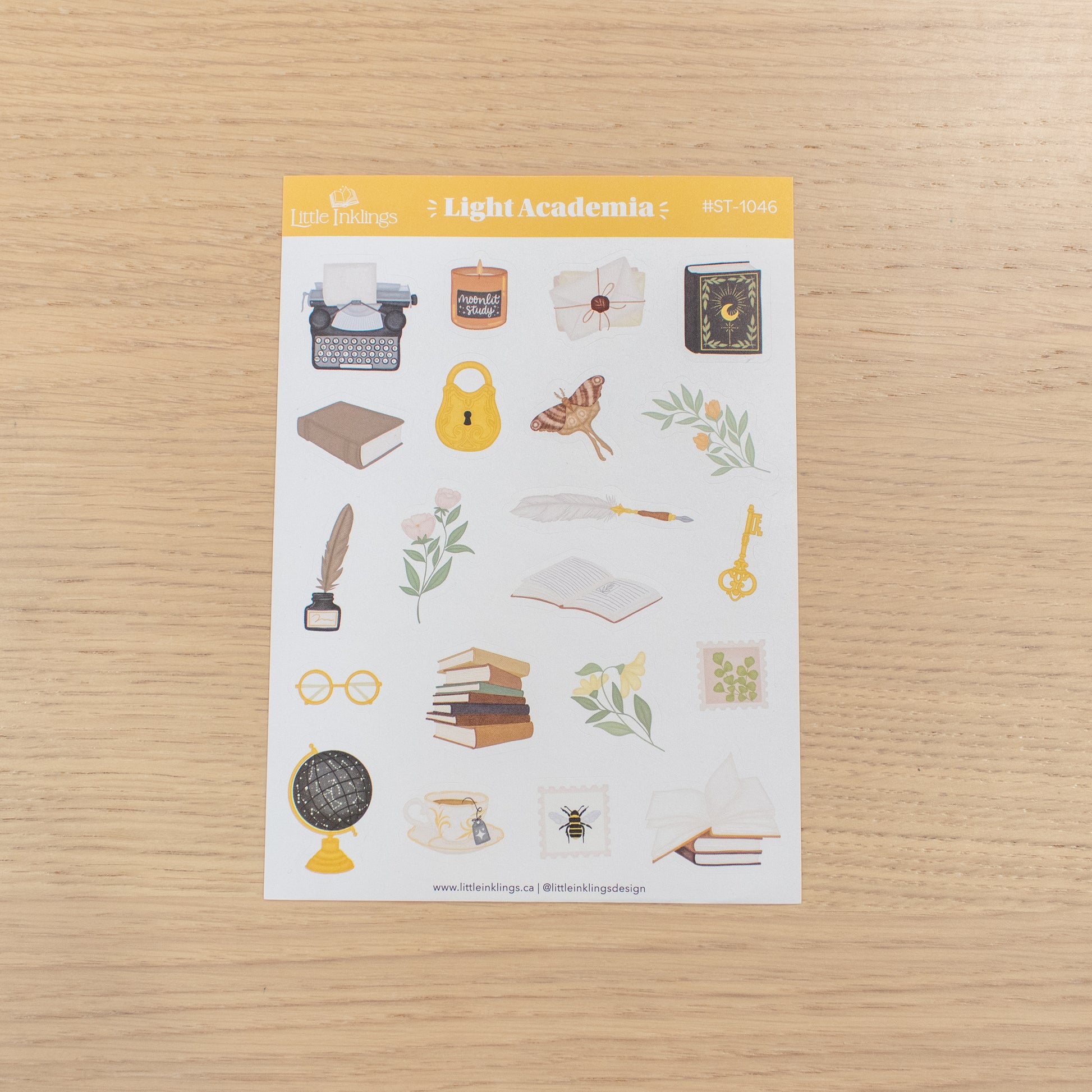 This sticker sheet includes 21 unique hand-illustrated academia-focused designs