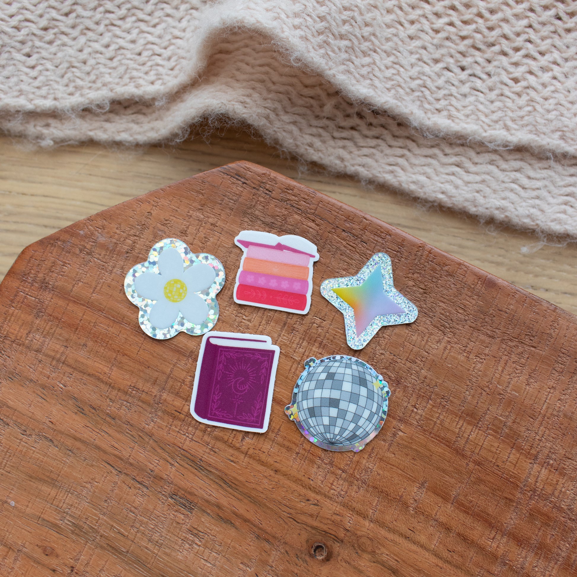 Set includes: stack of books, purple book, glitter disco ball, rainbow star, disco flower