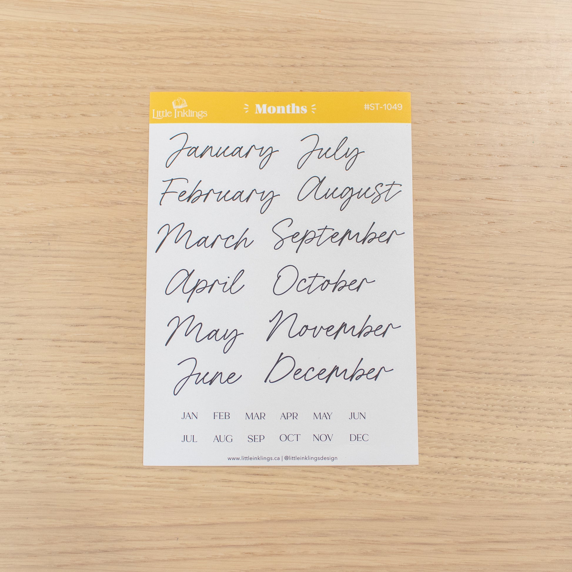 This sticker sheet includes 12 stickers with the month titles written in cursive and 12 mini stickers with the abbreviated months (these are sized to fit on the planner tabs)