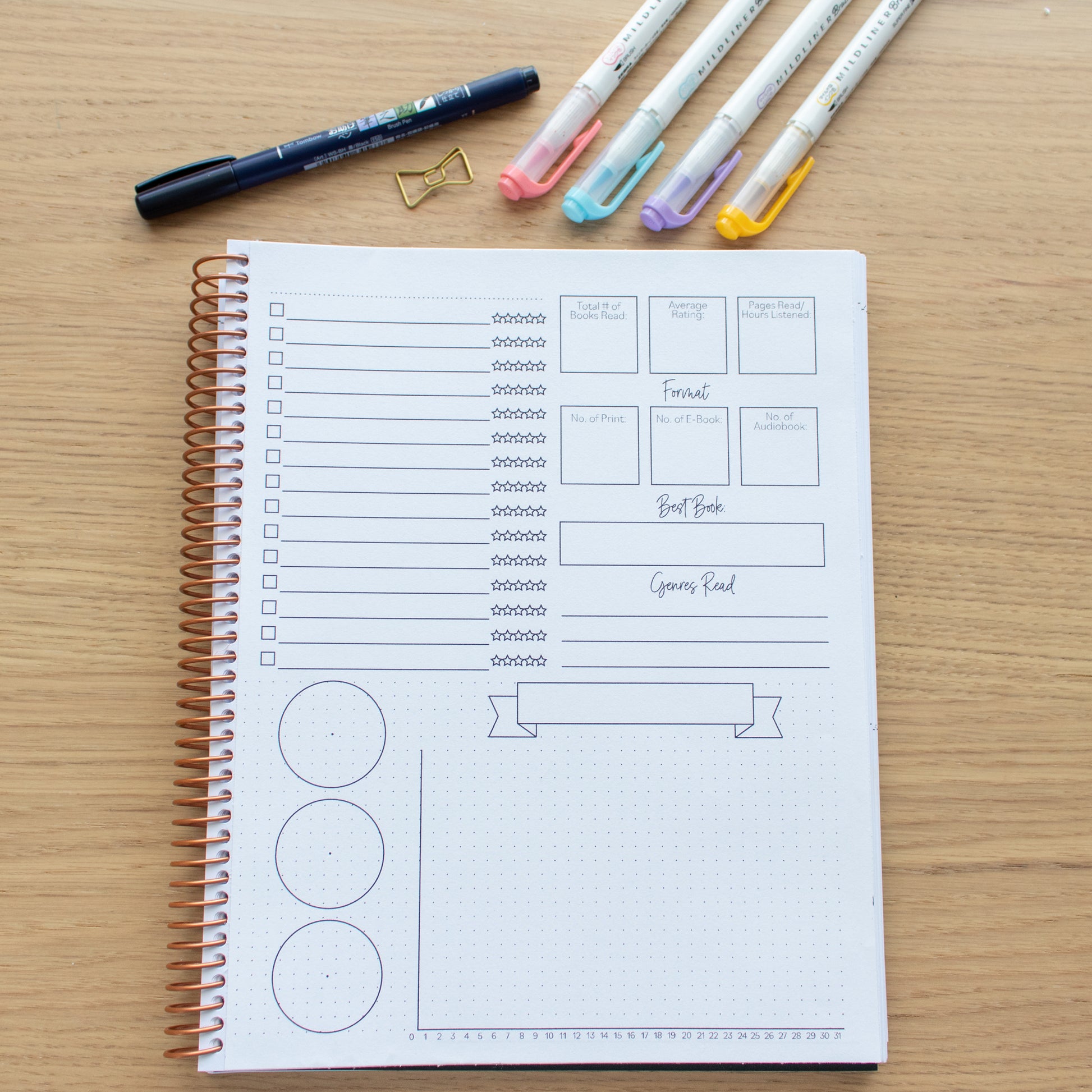 Want to customize the monthly dot-grid page into a wrap-up page? This printable focuses on documenting your monthly reading stats including a customizable bar graph and 3 mini pie charts that are ready for your data!