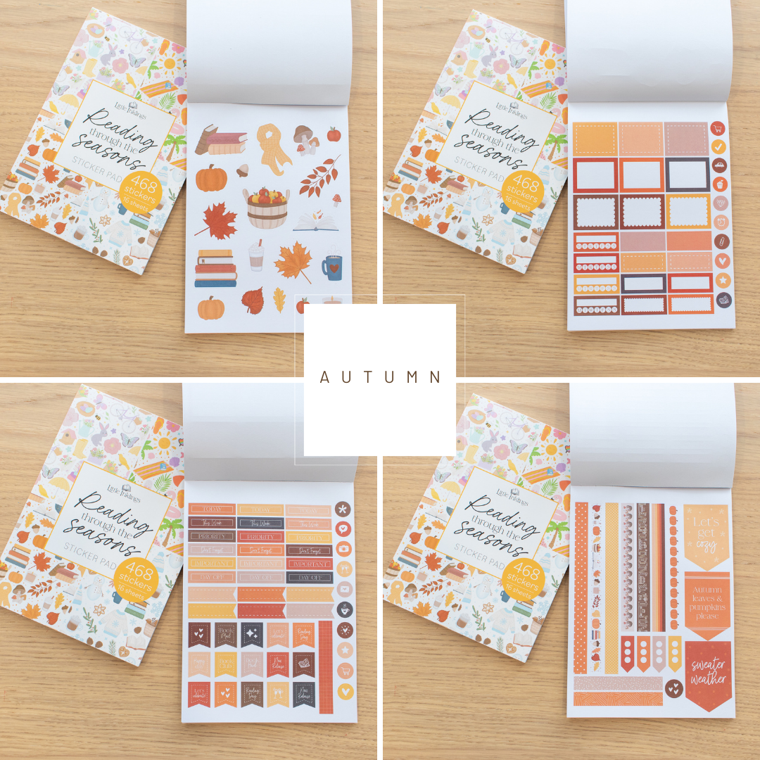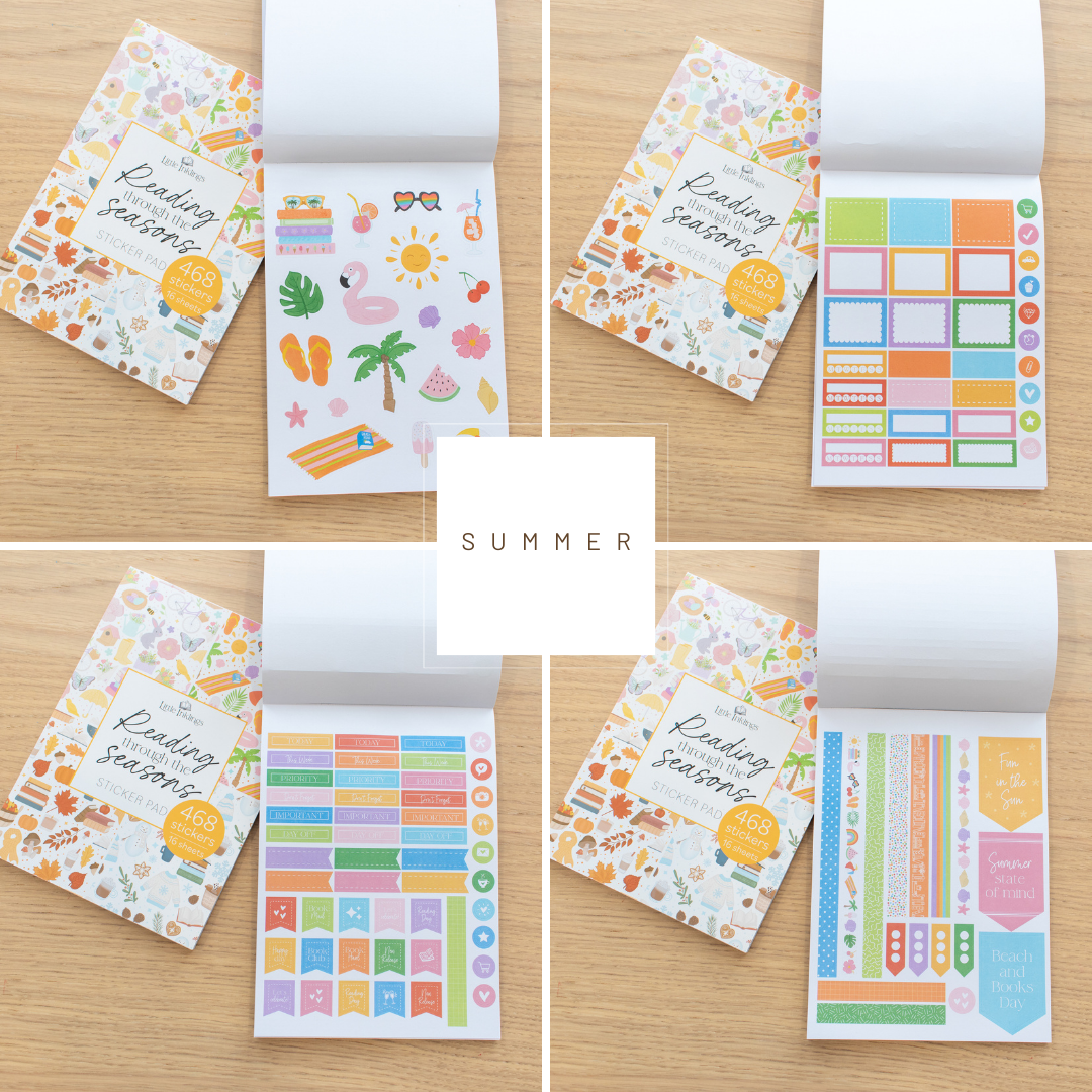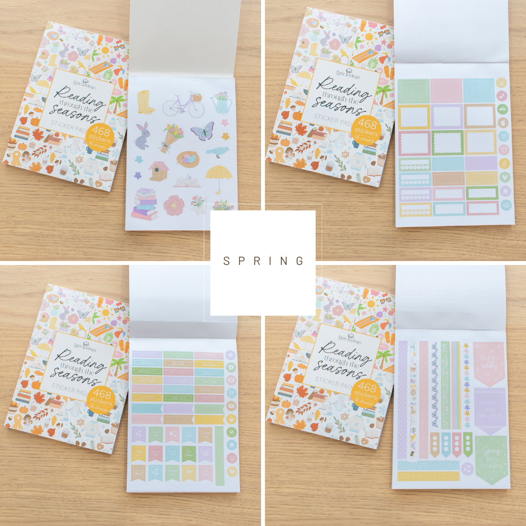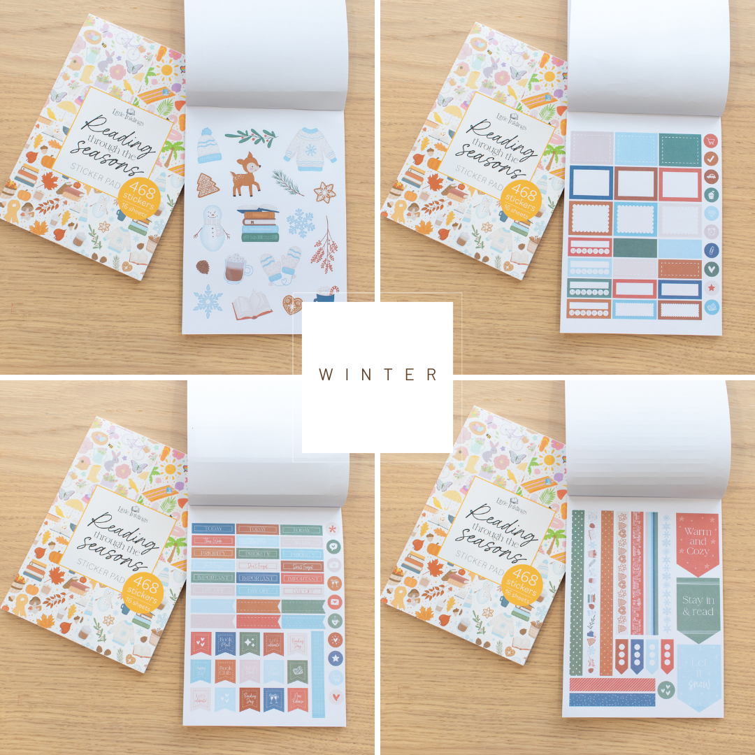 Reading Through the Seasons is a collection of 468 stickers spanning across all four seasons. Each season contains four sticker sheet filled with doodles, functional boxes of various sizes, banners, flags, icons, and tape each with a unique colour scheme.