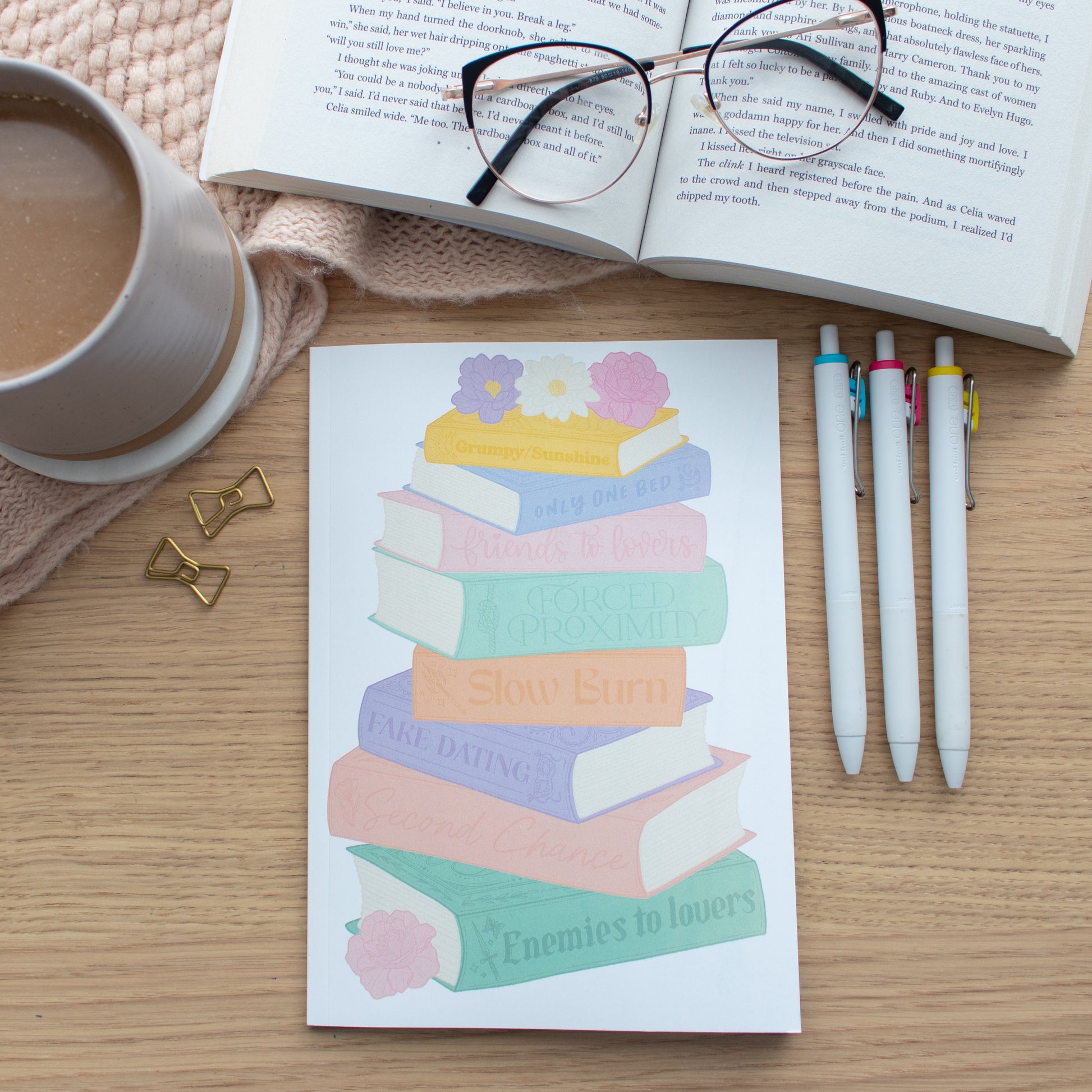 The romance book review notebook has a unique review layout to include a place to record the book trope and the spice rating.