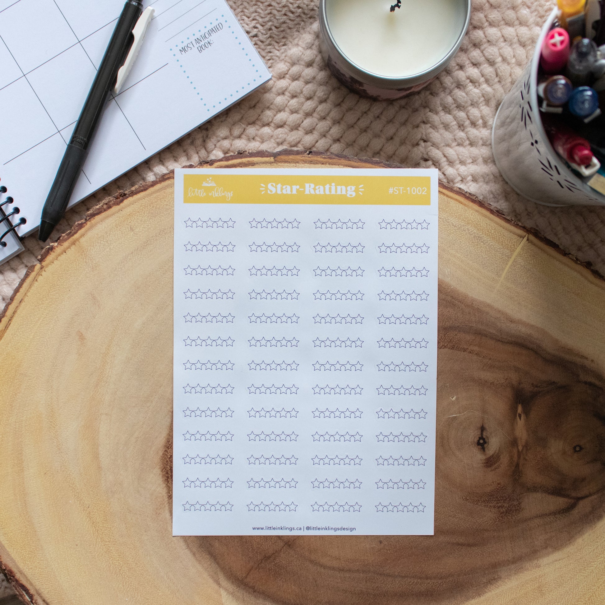 This sticker sheet includes 52 blank, black and white stars perfect for adding your rating to books, tv shows, movies, etc.