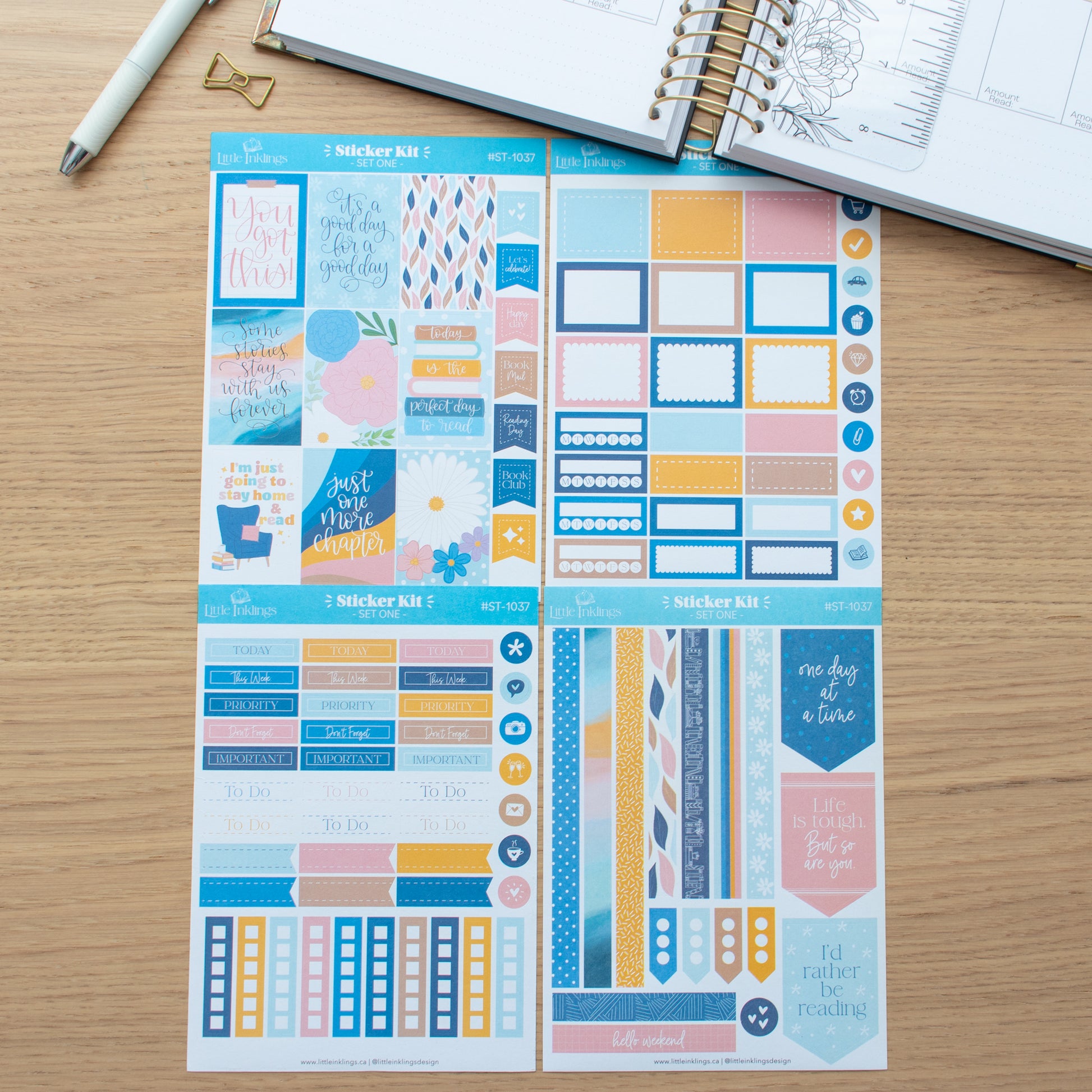Designed to perfectly fit the Vertical Layout of the Always Fully Booked planner, this sticker kit contains 4 sticker sheets with 108 stickers total of varying sizes including full boxes, half boxes, quarter boxes, to-do banners, long strips of 3 different lengths to cover multiple days, weekly habit trackers and more!