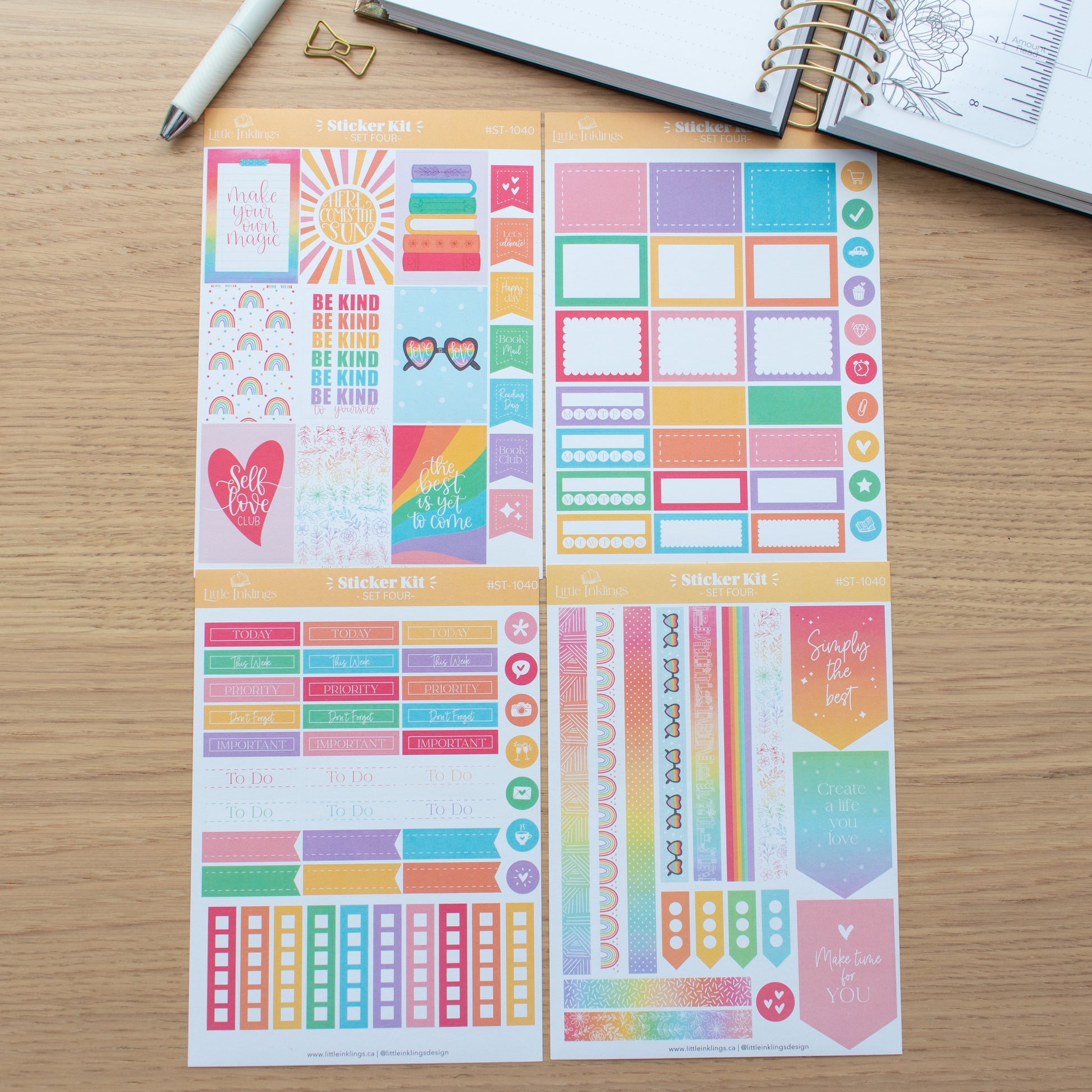 Designed to perfectly fit the Vertical Layout of the Always Fully Booked planner, this sticker kit contains 4 sticker sheets with 108 stickers total of varying sizes including full boxes, half boxes, quarter boxes, to-do banners, long strips of 3 different lengths to cover multiple days, weekly habit trackers and more!