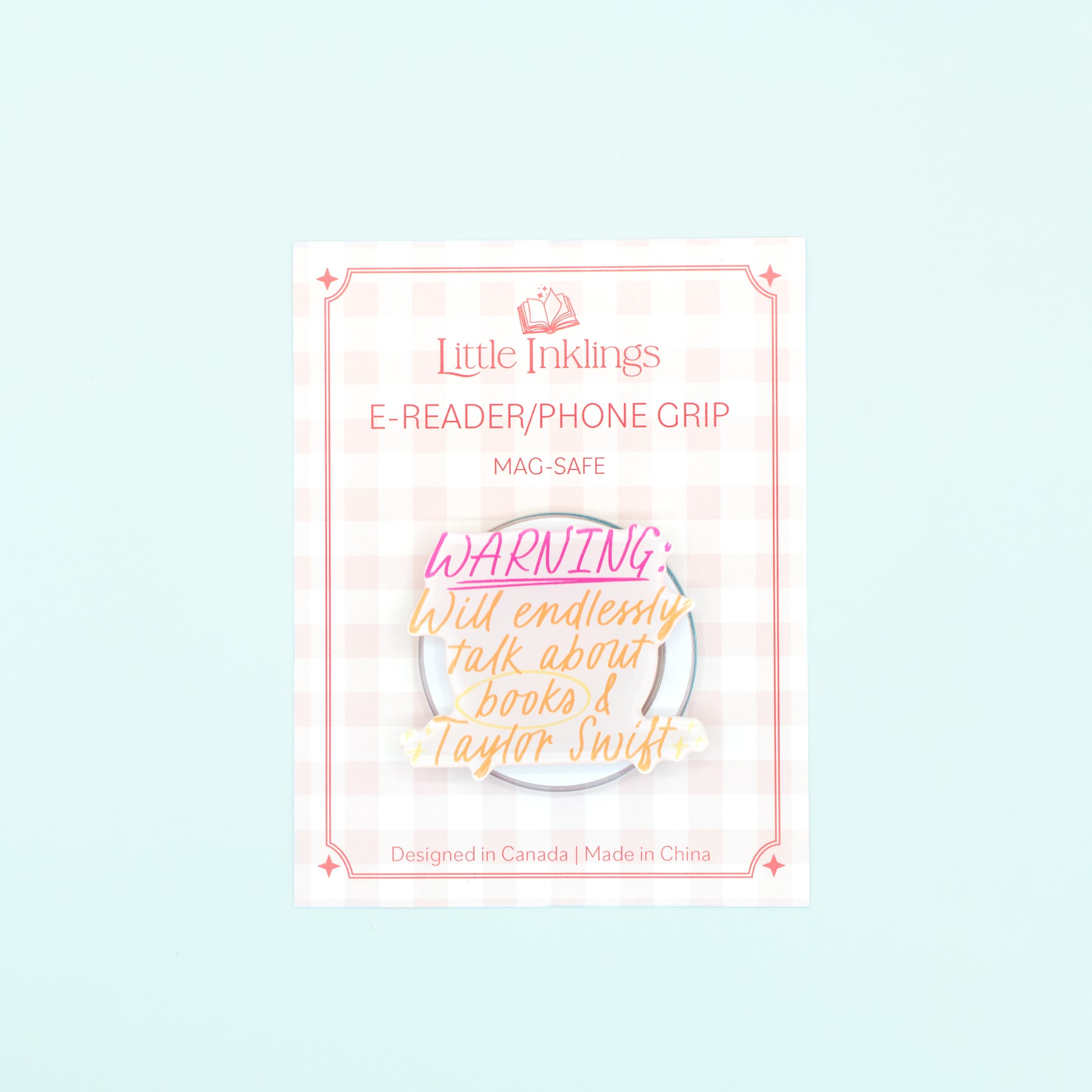 Design: Warning: will endlessly talk about books and Taylor Swift in pink and yellow script on a very light pink background
